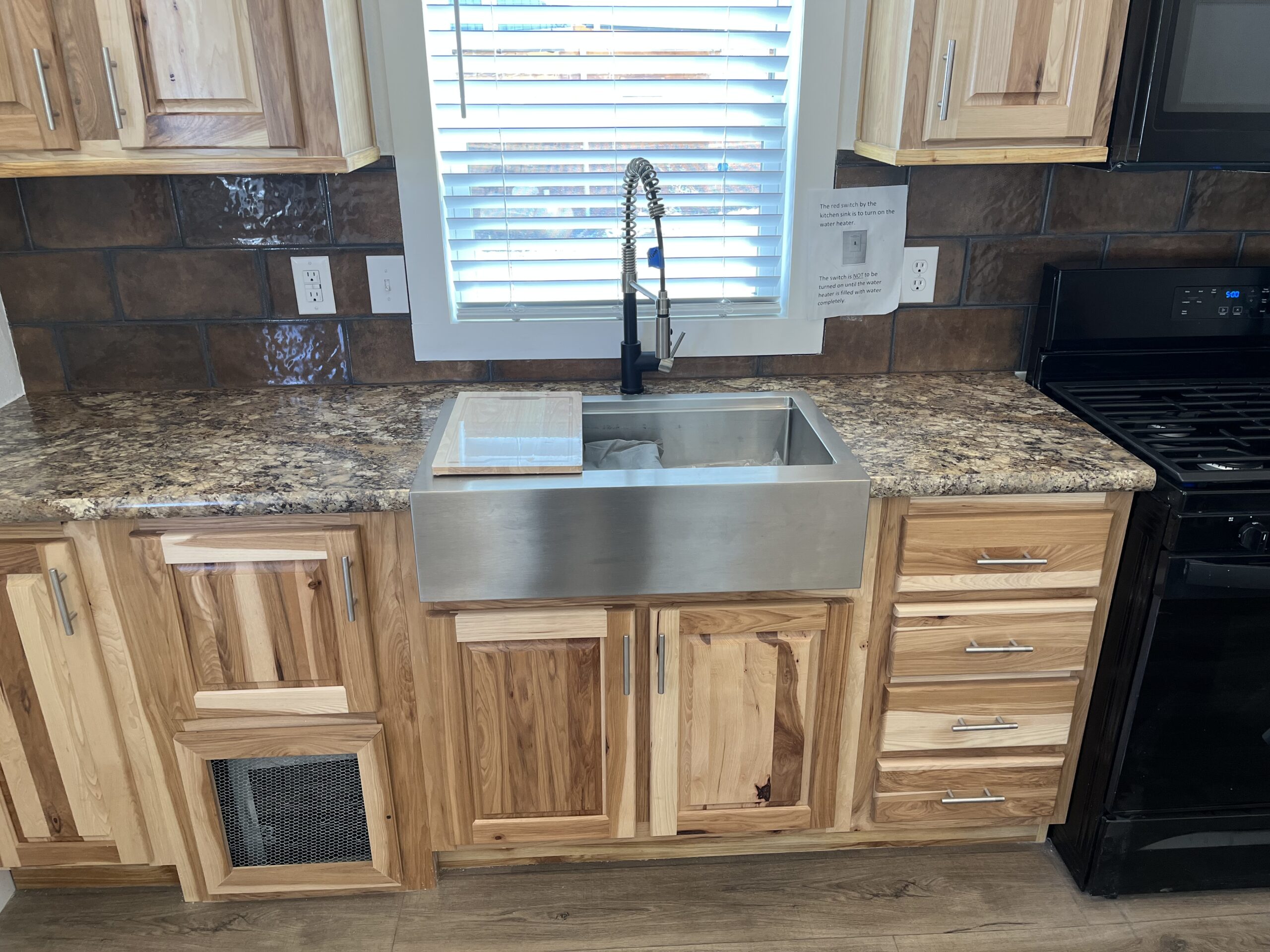 • Stainless steel farm sink with an upgraded pull-out faucet.